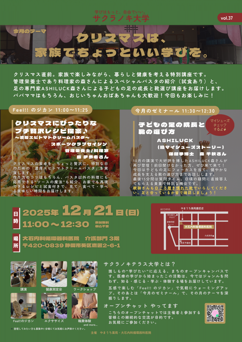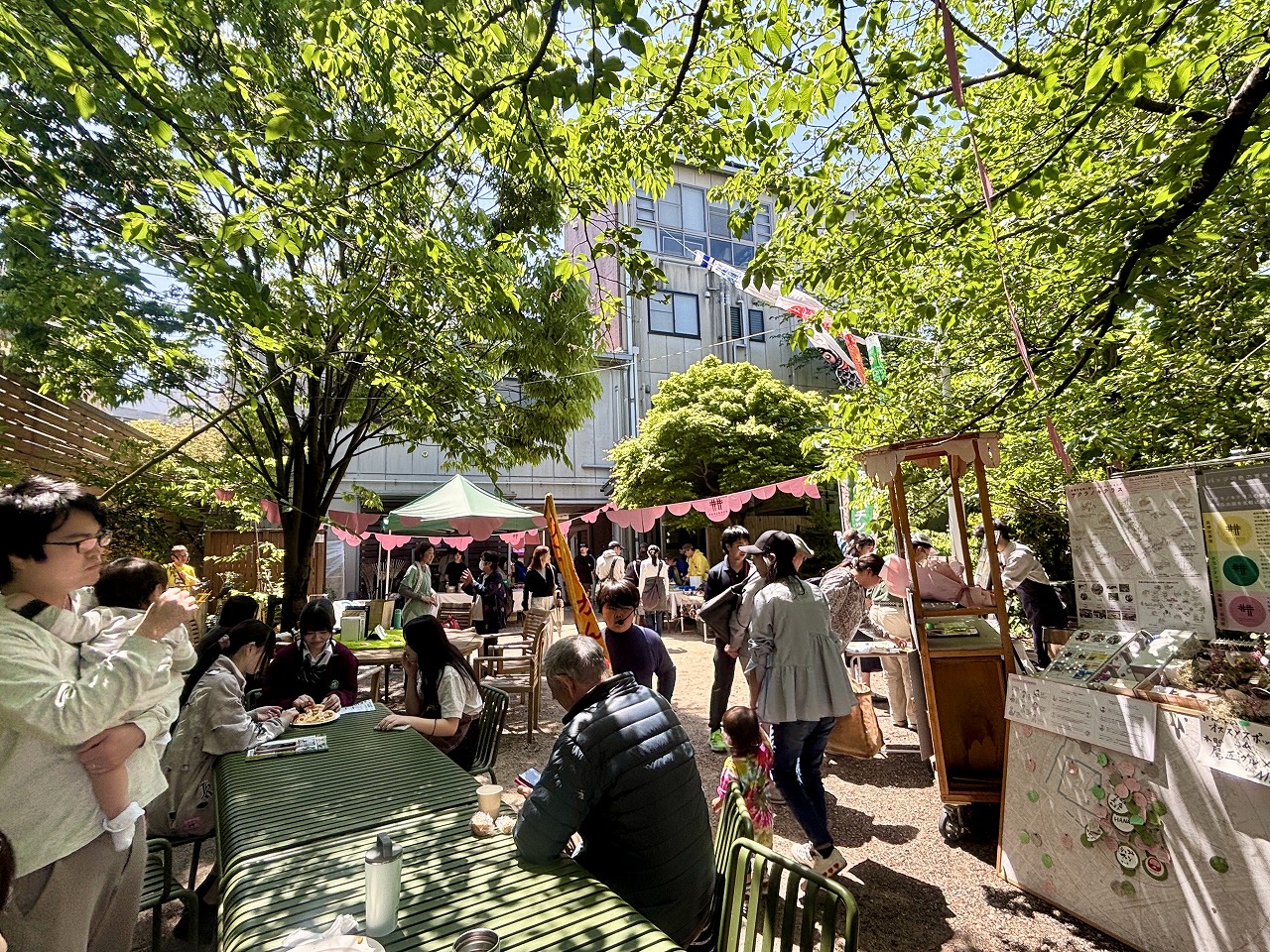 お医者さん・お茶屋さん・農家さん・整体師さんなど様々な仕掛人が月に一度、大石内科循環器科医院のお庭(サクラノキテラス)を街に開いて皆さんと一緒に「多世代・多様な人がごちゃ混ぜに交われる場」を目指しています。