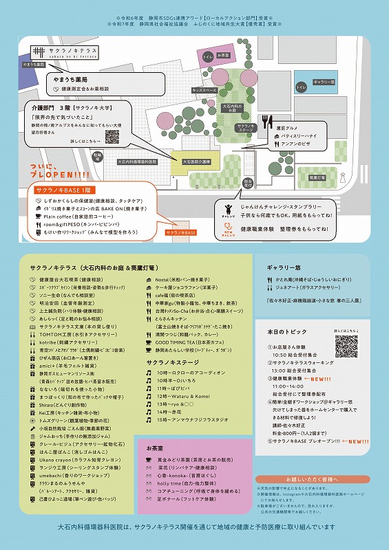 お医者さん・お茶屋さん・農家さん・整体師さんなど様々な仕掛人が月に一度、大石内科循環器科医院のお庭(サクラノキテラス)を街に開いて皆さんと一緒に「多世代・多様な人がごちゃ混ぜに交われる場」を目指しています。