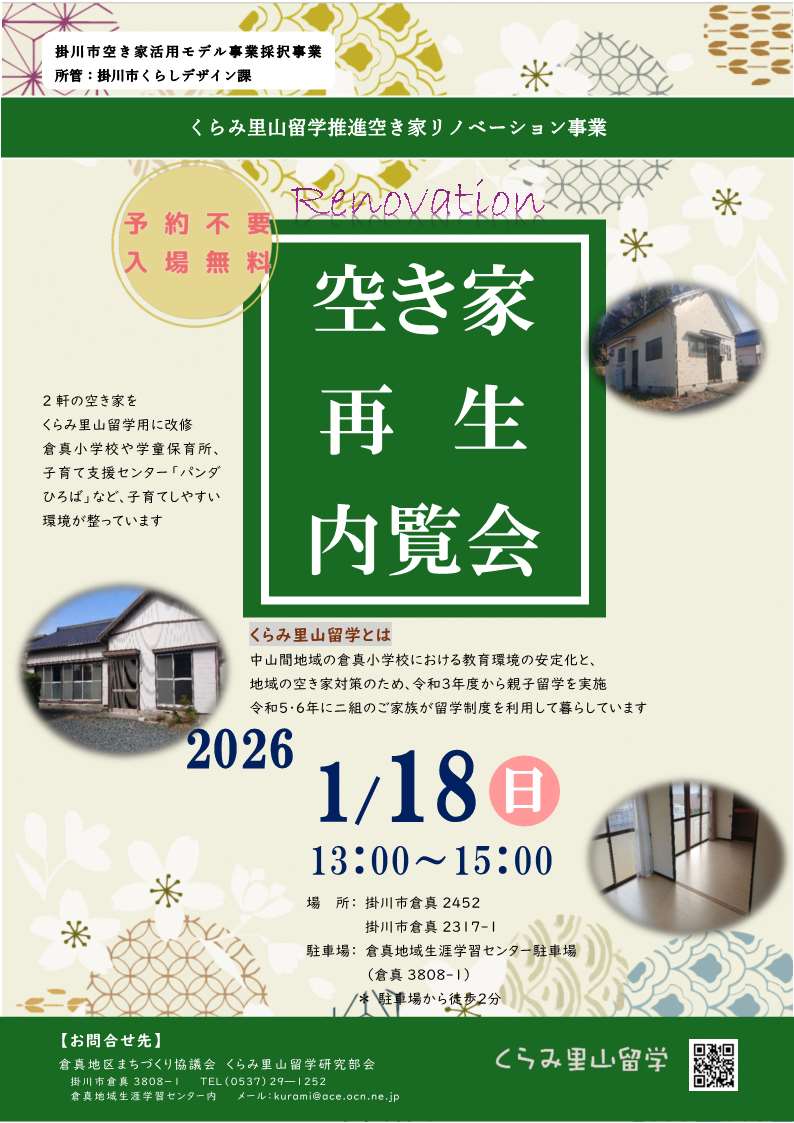 内 容:掛川市の「空き家活用モデル事業補助金」を活用し、リノベーションされた2軒の物件の内覧会です。予約不要ですので、里山留学や移住に興味のある方はぜひお気軽にご来場ください。