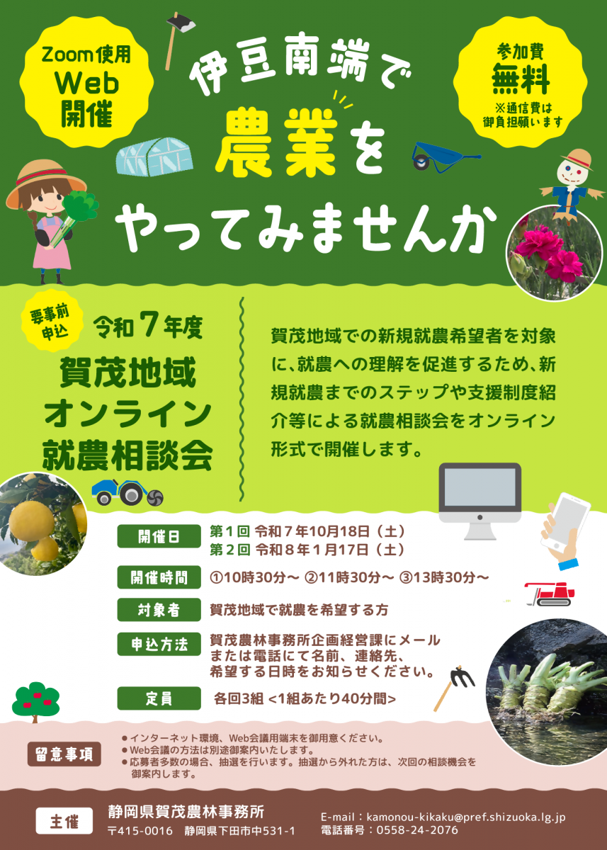 賀茂地域(伊豆南部)での新規就農希望者を対象に、就農への理解を促進するため、新規就農までのステップや支援制度紹介等による就農相談会をオンラインで開催します。